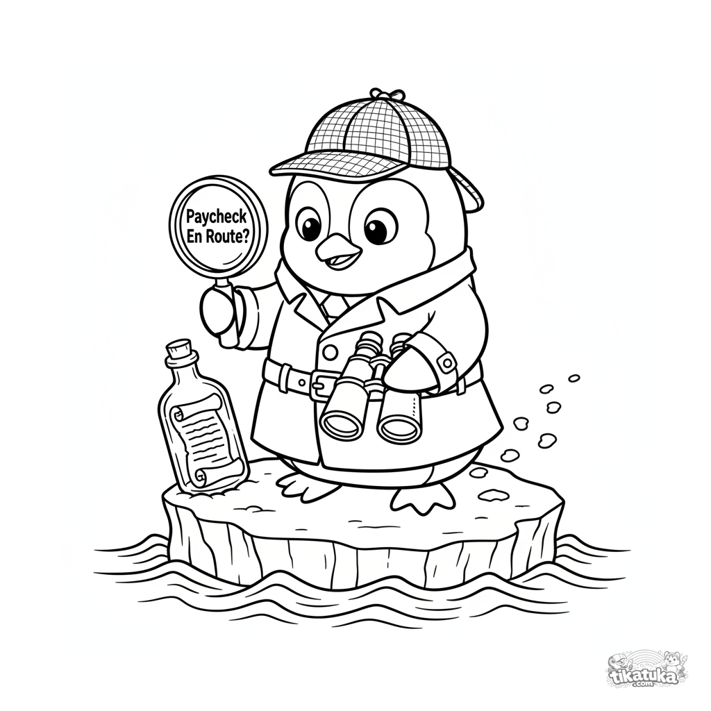 Ausmalbild für Kinder 10-12: Ein Pinguin-Detektiv in einem Trenchcoat auf einem Eisberg benutzt Fernglas und Lupe, um einen vermissten Gehaltsscheck zu untersuchen.
