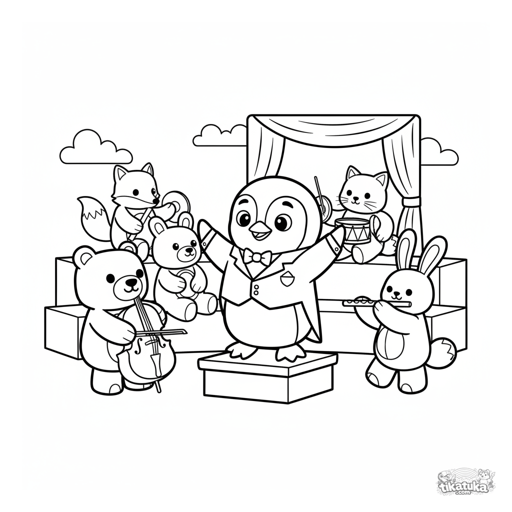 Ausmalbild für Kinder: Pinguin Marcel als Dirigent eines Spielzeugorchesters. Lustige Szene im Holzspielzeug-Stil.