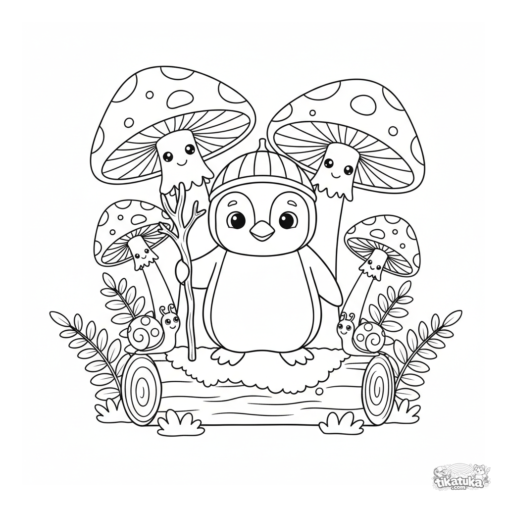 Ausmalbild für Kinder 4-8: Kochpinguin Marcel mit Eichelhut als Helm bewacht magische Pilze im Wald. Eine nette Märchenszene zum Ausmalen.