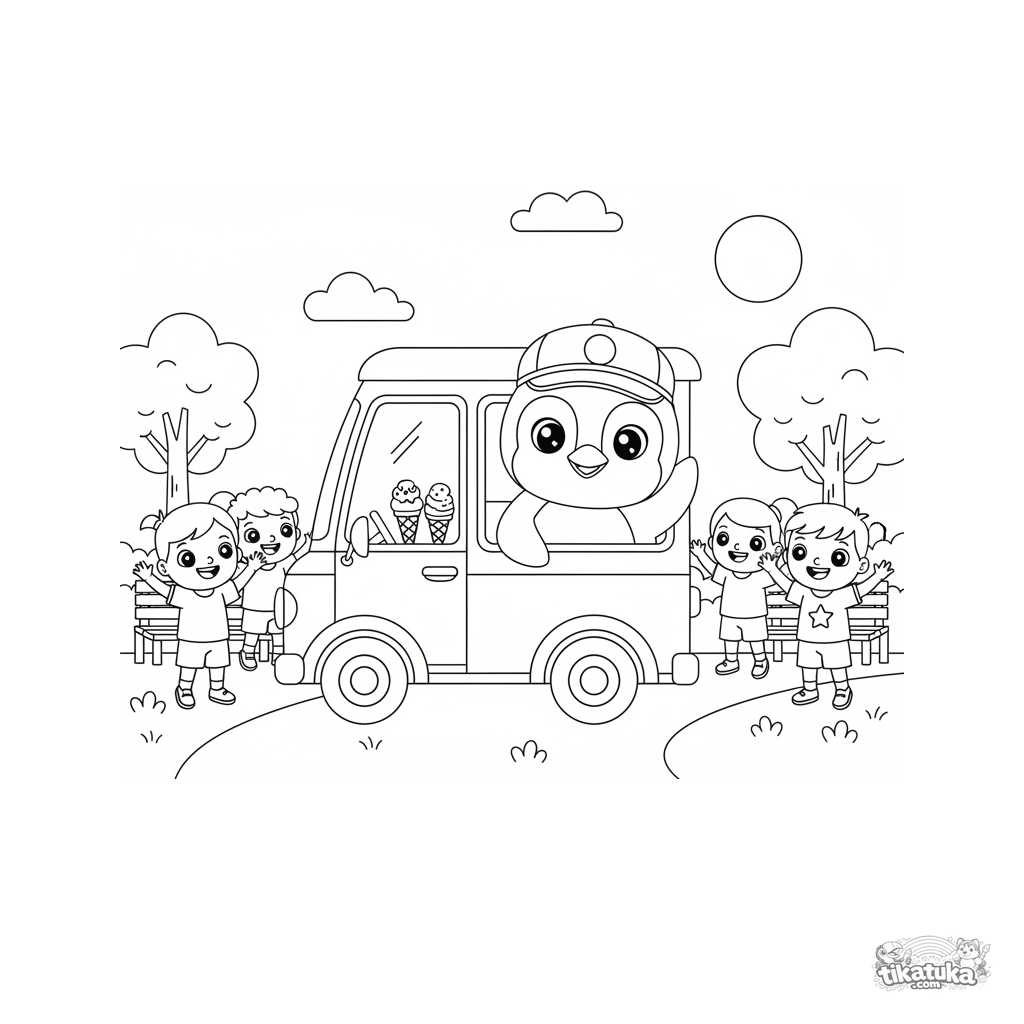 Ausmalbild für Jungen 4-6: Pinguin Marcel fährt einen fröhlichen Eiscreme-Lastwagen eine Parkallee entlang und winkt Kindern zu. Plüschmaskottchen im skandinavischen Stil.