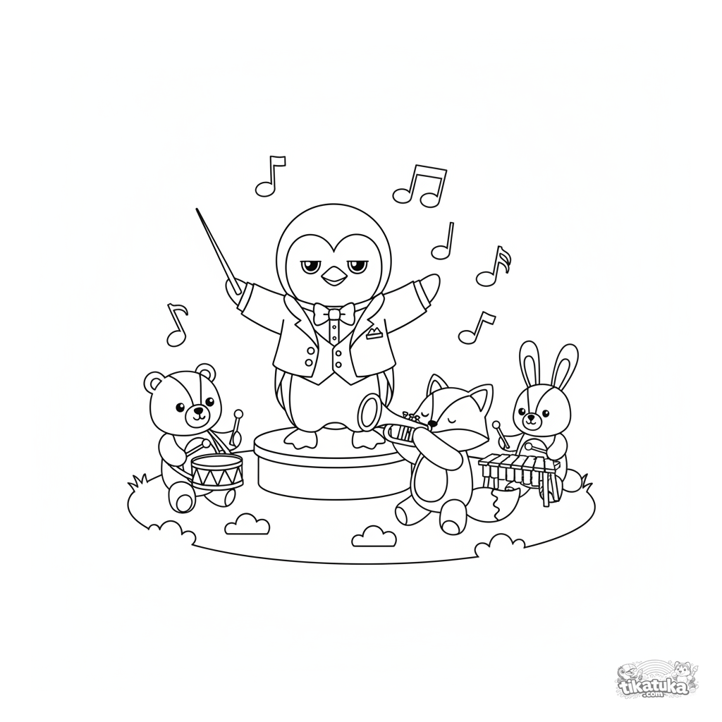 Ausmalbild von Dirigent Pinguin Marcel, der ein Spielzeugorchester leitet. Für Kinder von 4-6 Jahren. Fröhliche Szene im Plüsch-Maskottchen-Stil.
