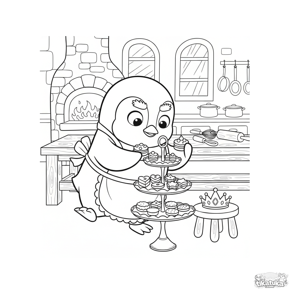 Ausmalbild für Mädchen 4-6: Pinguinkoch Marcel richtet Süßigkeiten für eine königliche Teeparty in einer Schlossküche an. Weiche Puppenstilistik.