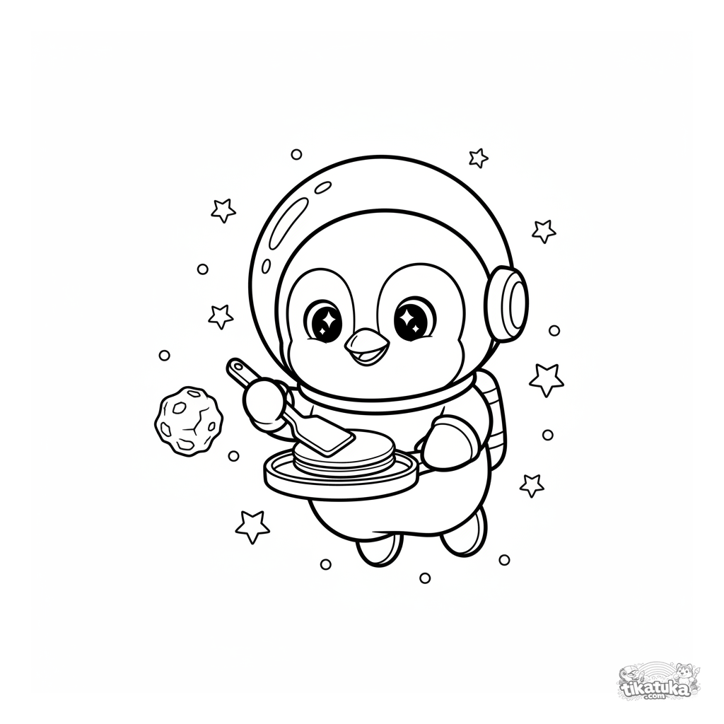 Ausmalbild von Koch Pinguin Marcel, der im Weltraum kocht. Für Kinder von 4-6 Jahren. Lustige Szene im Plüsch-Maskottchen-Stil.