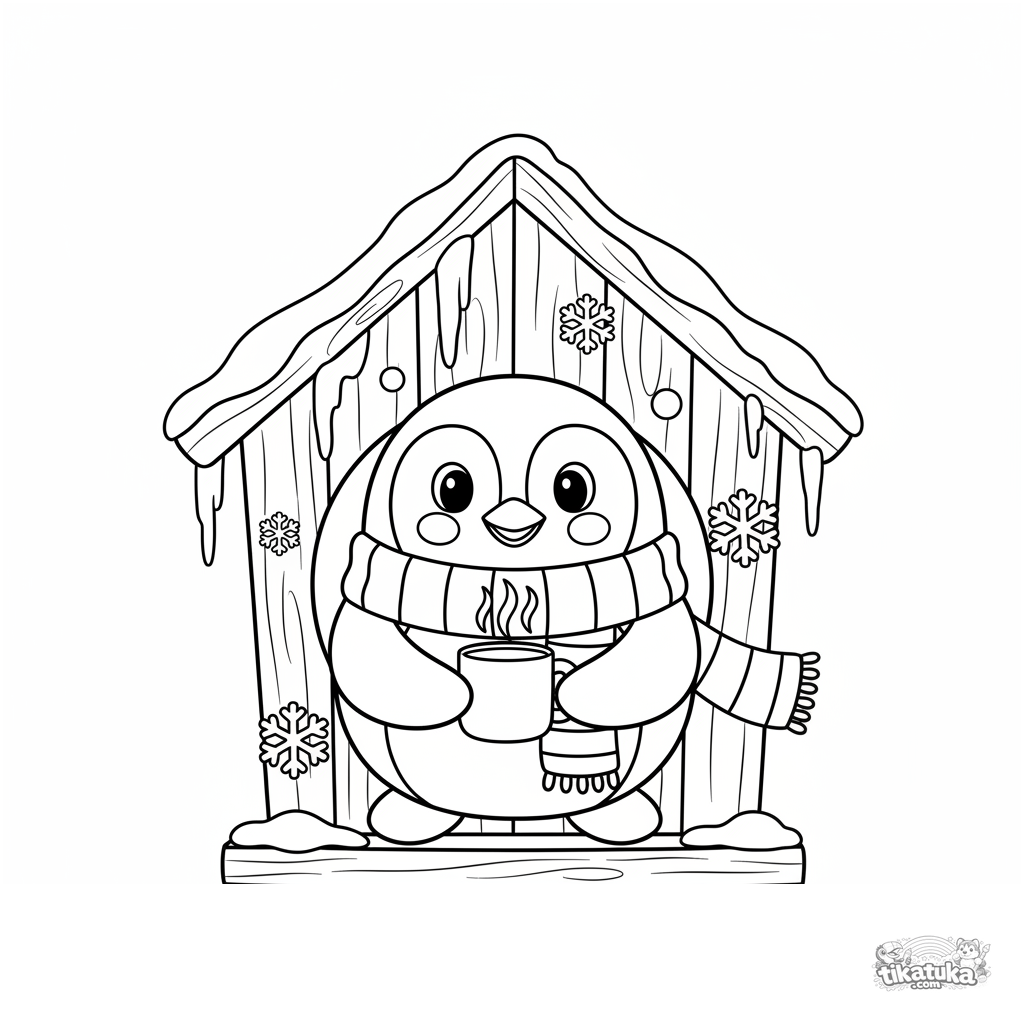 Einfaches Ausmalbild für Kleinkinder 2-3: Ein Plüschpinguin mit Schal guckt aus einem verschneiten Holz-Vogelhaus und hält eine Tasse.