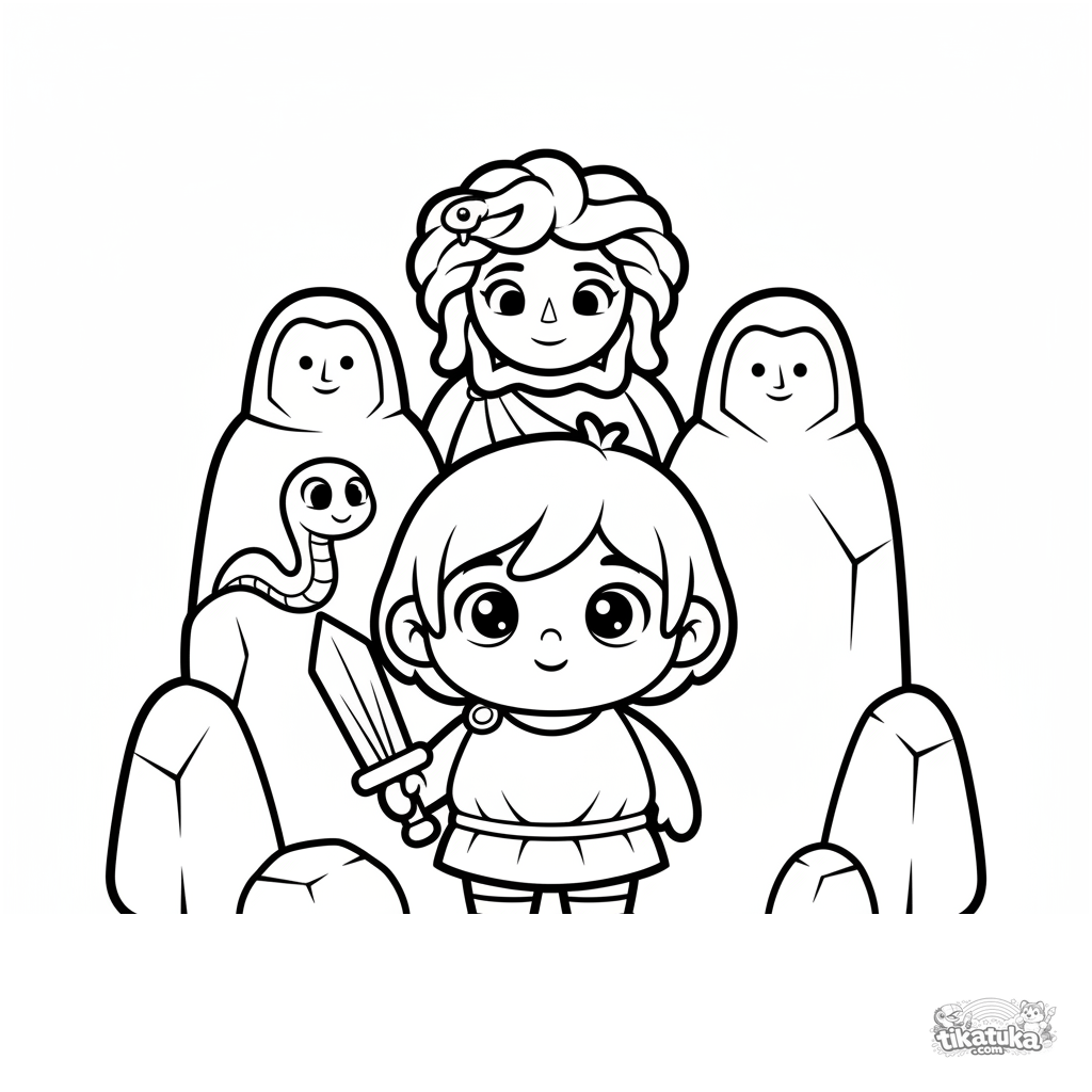 Einfaches Ausmalbild für Kleinkinder: Der kleine Perseus besucht Tante Medusas Höhle.