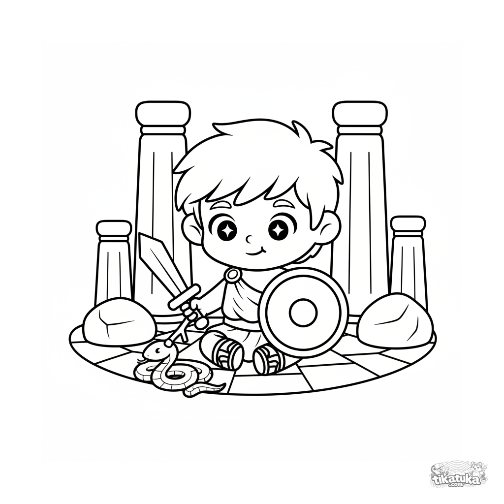 Einfaches Ausmalbild für Kleinkinder 2-3: Kleiner Perseus mit einem Spielzeutschild sitzt auf dem Boden der Gorgonenhöhle.