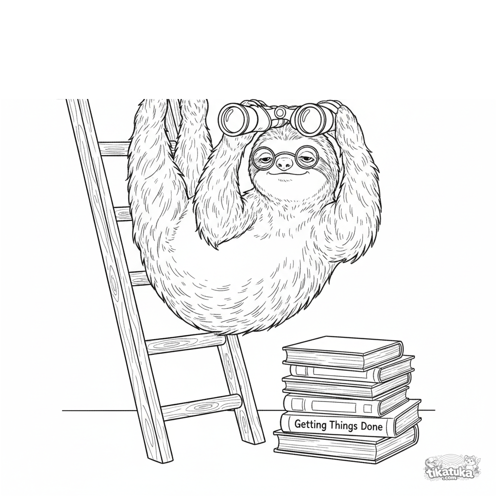 Ausmalbild für Kinder 10-12: Ein philosophisches Faultier mit Brille hängt an einer Bibliotheksleiter und schaut mit Fernglas in ein Wirtschaftsbuch. Ironisches Meme.