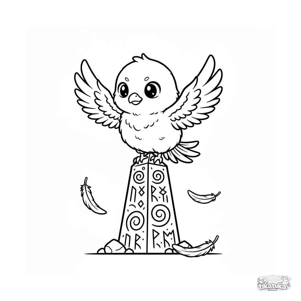 Ausmalbild für Kinder von 7-9 Jahren: Ein flauschiges Phönix-Küken lernt, auf einem hohen Runenmonolithen das Gleichgewicht zu halten. Eine dynamische und niedliche Szene im Anime-Stil.