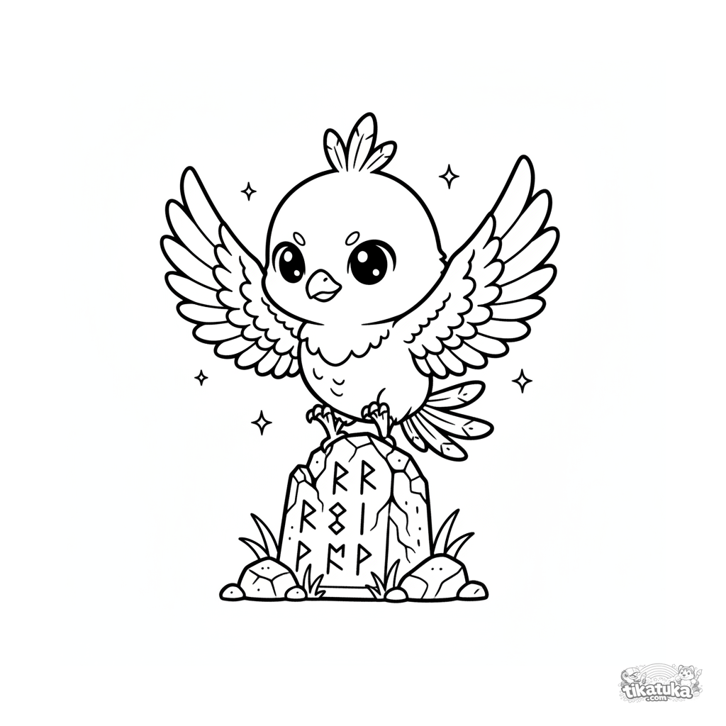 Ausmalbild eines flauschigen Phönix-Kükens, das fliegen lernt, neben einer alten Runensäule. Für Kinder von 4-6 Jahren. Niedliches und magisches Wesen.