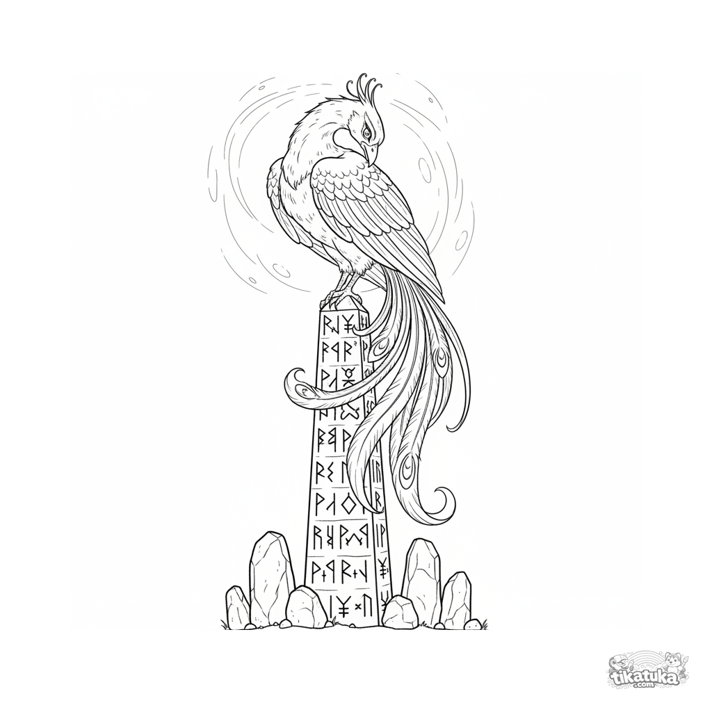 Ausmalbild für Kinder 7-9 Jahre: Ein majestätischer Phönix thront auf einem uralten runischen Obelisken. Mäßiges Detail, ausdrucksstarke Pose.