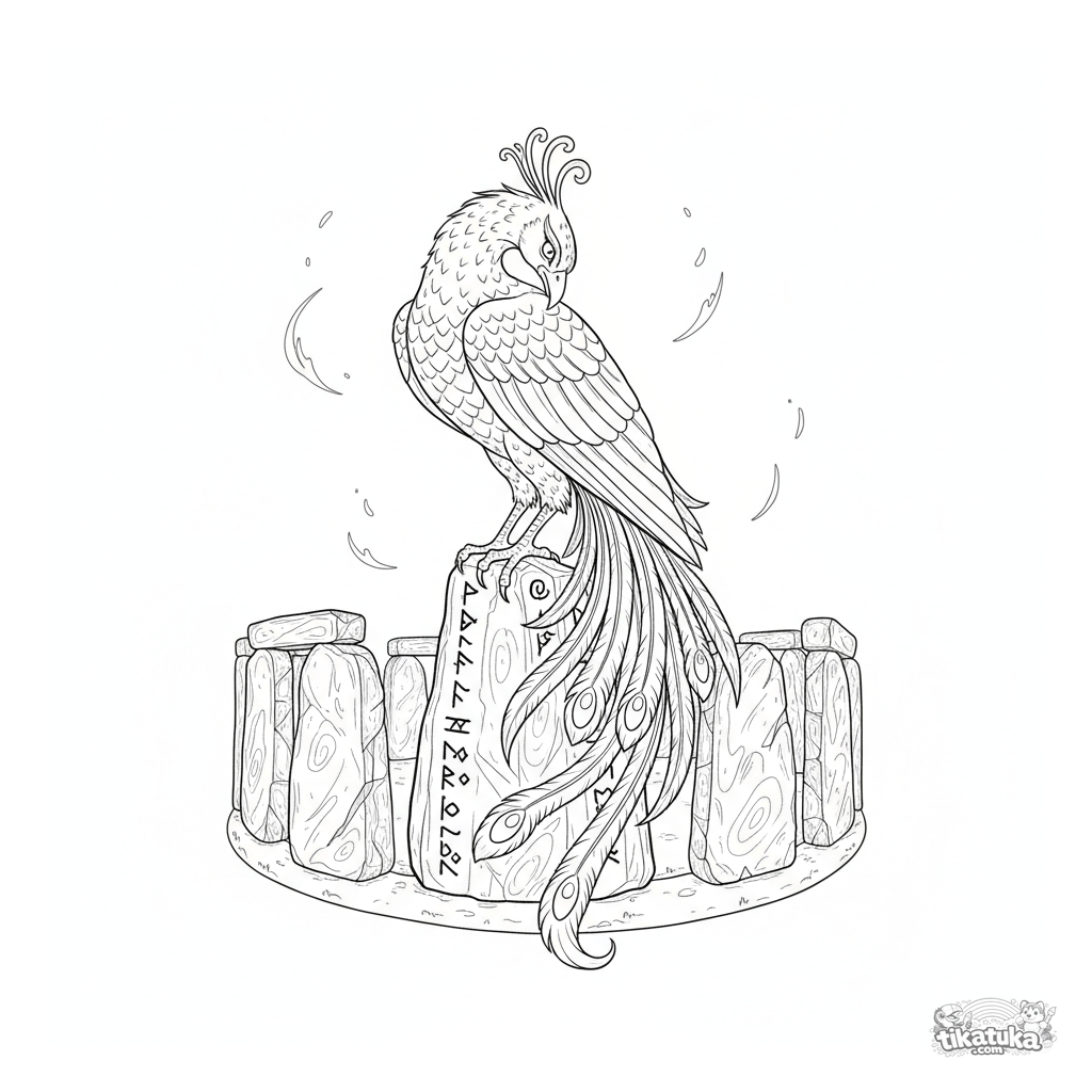 Detailliertes Ausmalbild für ältere Kinder von 10-12 Jahren: ein majestätischer Phönix ruht auf einem alten, runenbedeckten Monolithen. Komplexe Linienführung, geschichtete Szene, reicher Hintergrund für kreatives Ausmalen.
