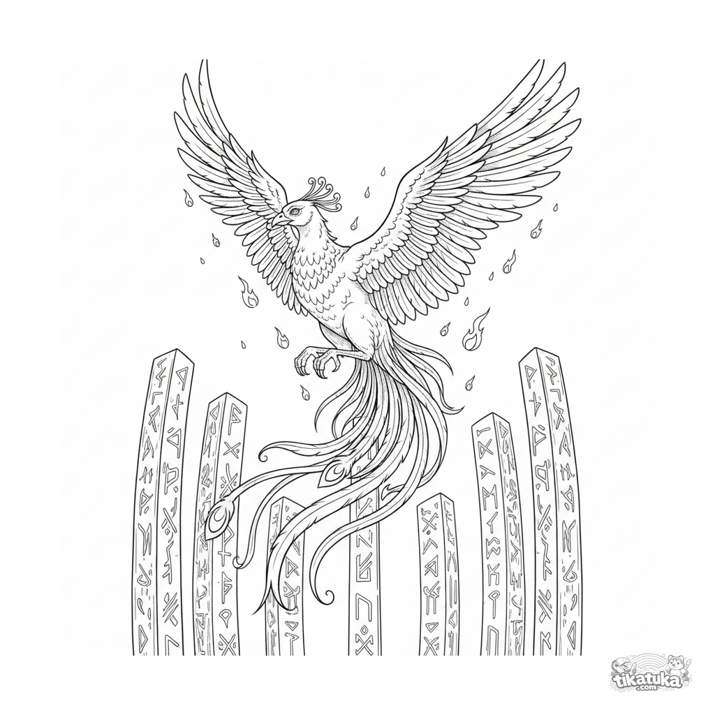 Komplexes Ausmalbild für Kinder von 10-12 Jahren: ein majestätischer Phönix erhebt sich aus der Mitte eines Kreises alter Runenmonolithen. Detaillierte Federn und dynamische Komposition.