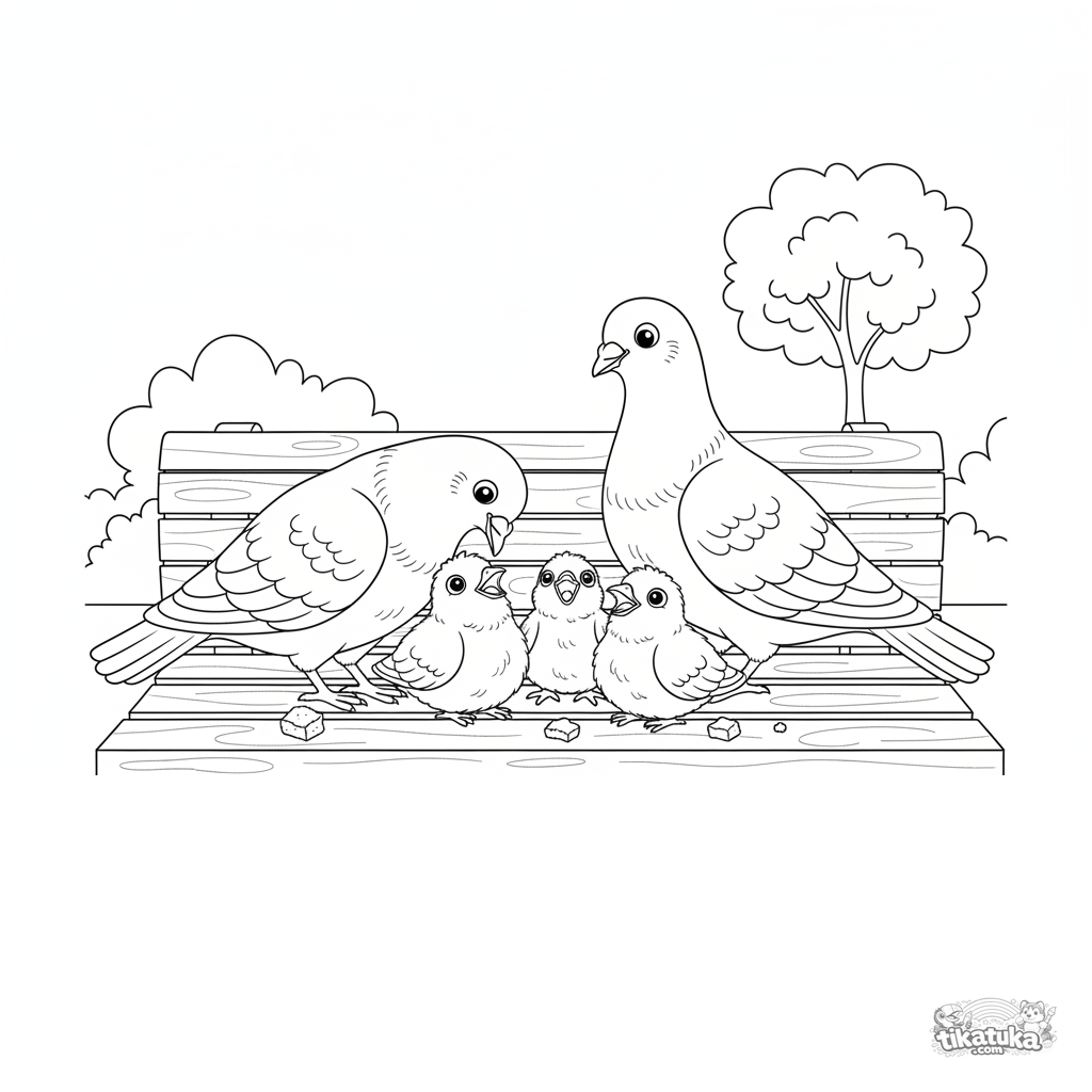 Ausmalbild für Kinder 7-9: Eine realistische Szene einer Taubenfamilie auf einer Parkbank, bei der die erwachsenen Vögel sich um ihre flauschigen Küken kümmern.