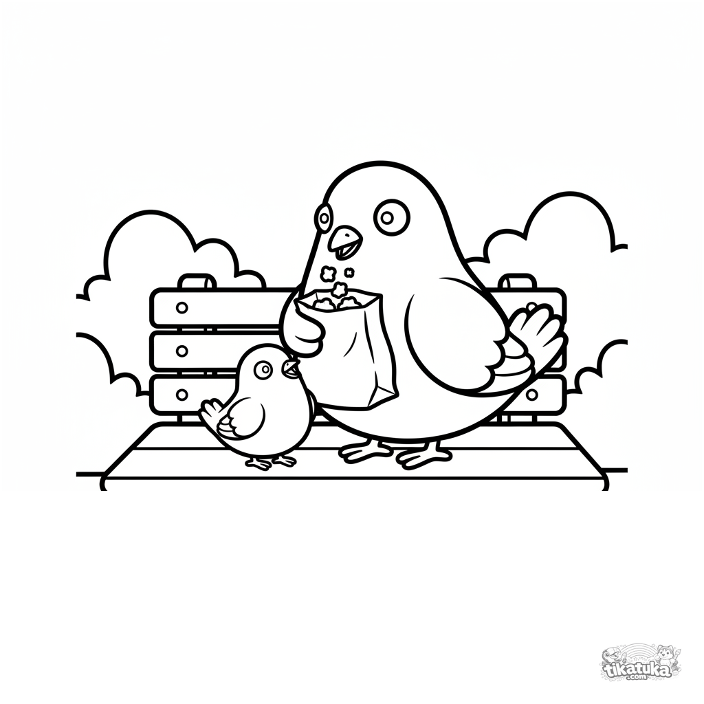 Sehr einfaches Ausmalbild für Kleinkinder 2-3: Eine Taubenfamilie picknickt auf einer Parkbank. Sehr große Formen.