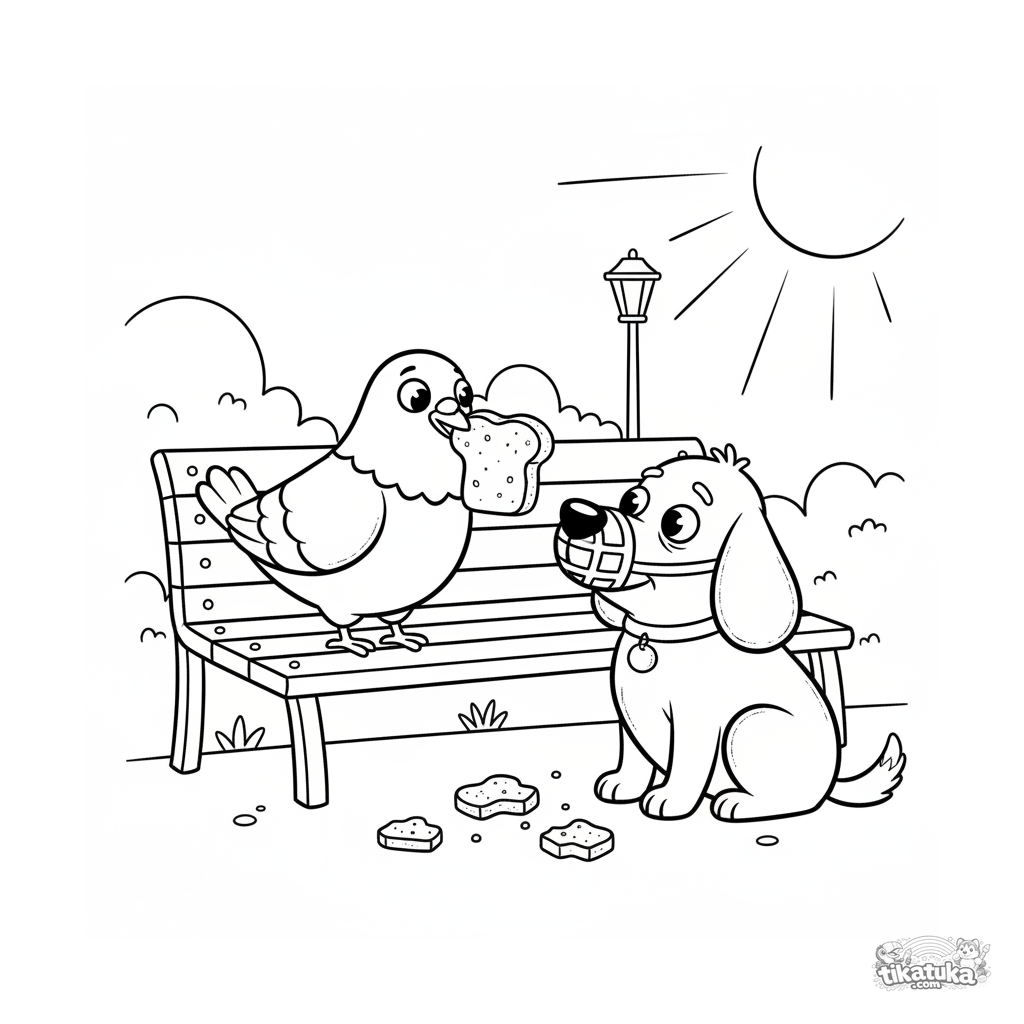 Ausmalbild für Kinder 4-6: Eine Taube füttert einen alten Hund an einer Parkbank. Berührende Szene über Freundschaft.