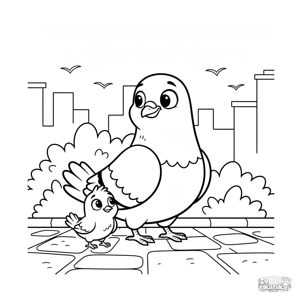 Kinder-Ausmalbild: Eine fürsorgliche Stadttaube führt ein winziges, verlorenes Küken einen Parkweg entlang. Rührende Szene von Schutz und Hilfe während des Zuges.