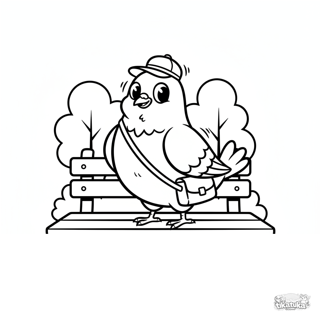 Ausmalbild für Kinder 4-6: Eine Taube mit Botenmütze holt eine Nachricht aus ihrer Tasche, während sie auf einer Parkbanklehne steht. Lustiger Retro-Stil.
