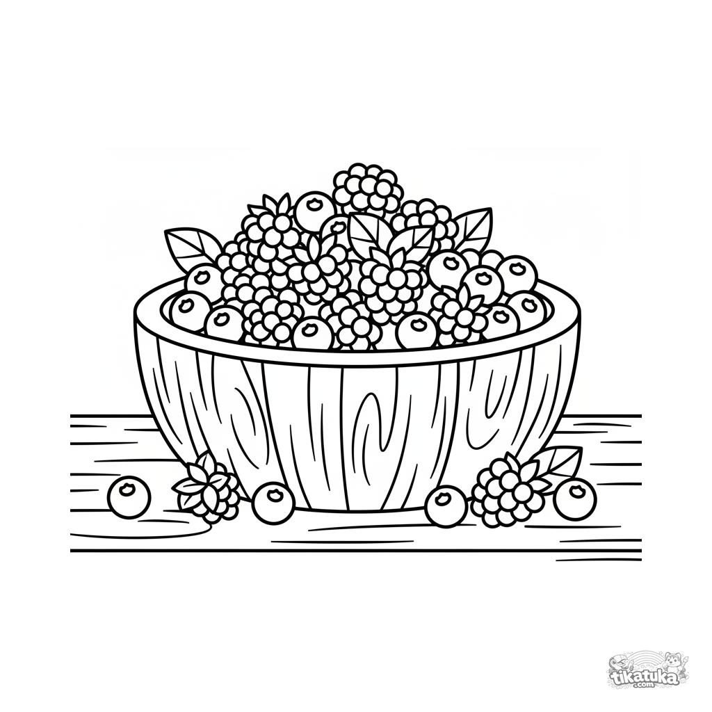 Ausmalbild einer Holzschüssel voller gemischter Beeren. Für Kinder von 4-6 Jahren. Auf einer Küchenarbeitsplatte liegen Himbeeren, Brombeeren, Blaubeeren und verstreute Blätter.