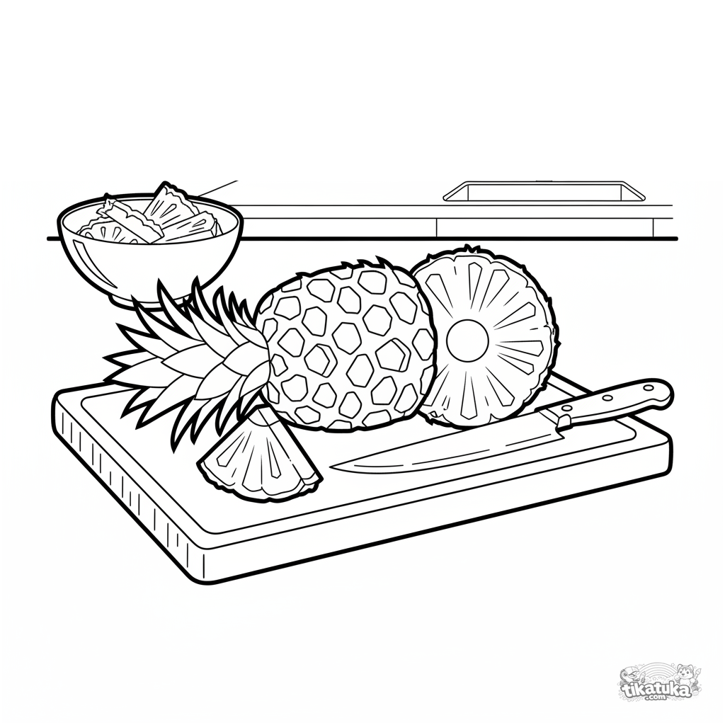 Ausmalbild einer Ananas, die auf einem Schneidebrett geschnitten wird, Innenansicht zeigend. Für 7-9 Jahre. Realistischer Aquarell-Skizzen-Stil, Küchenszene.
