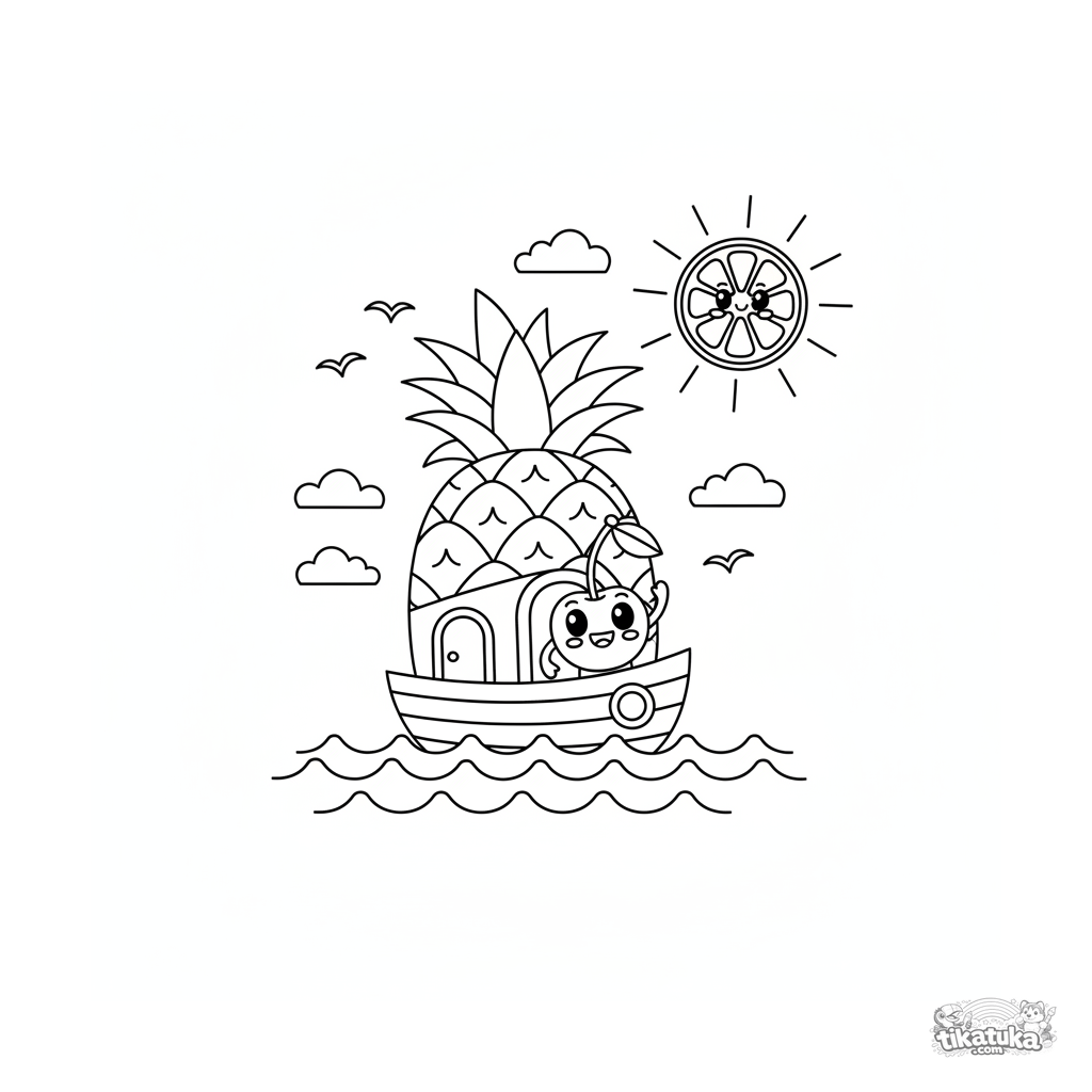Ausmalbild für Kinder 4-6: ein fröhliches Ananasboot segelt auf einem Saftmeer. Paper-Cut-Stil, einfache Wellenlinien.