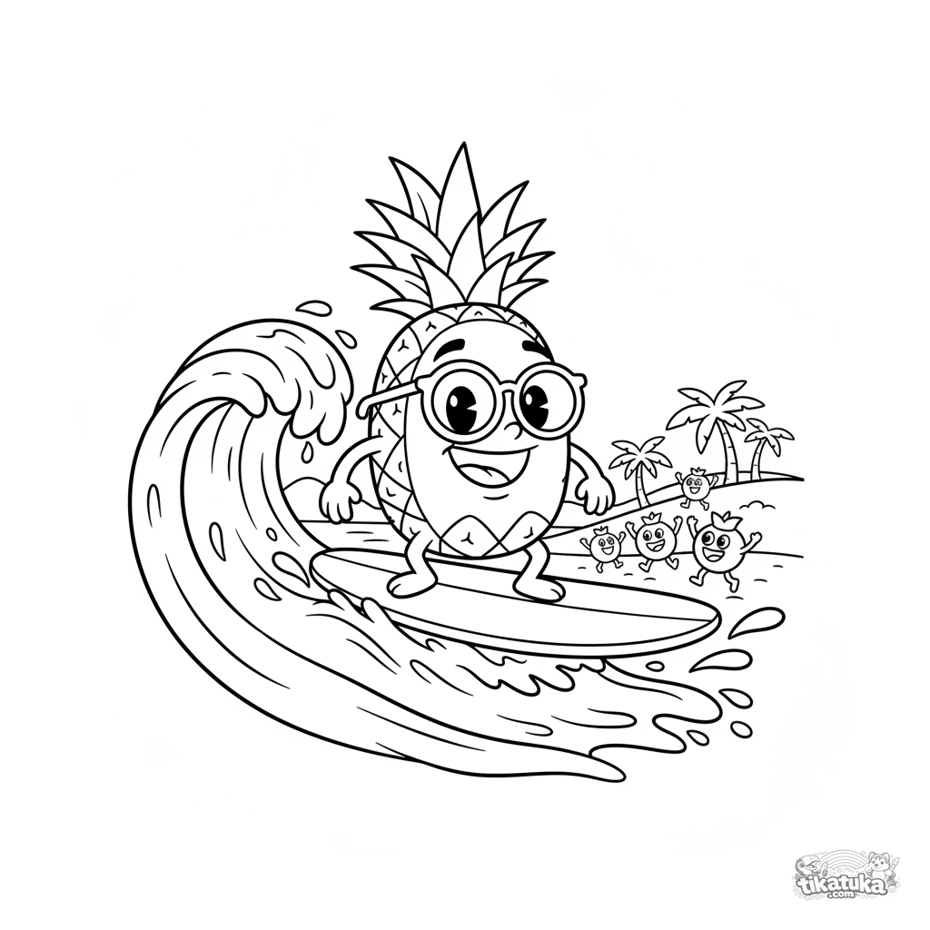 Lustiges Ausmalbild: Eine Ananasscheibe mit Sonnenbrille surft auf einer Saftwelle. Für Kinder von 7-9 Jahren.