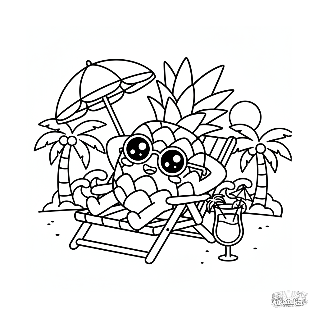 Ausmalbild für Kinder 7-9: eine coole Ananas mit Sonnenbrille liegt auf einem Strandstuhl. Retro-Stil der 90er Jahre inspiriert.