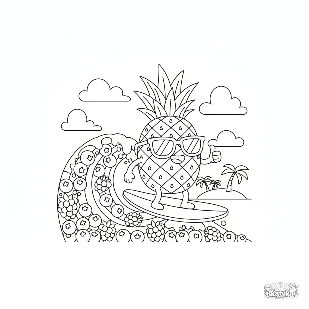 Lustiges Ausmalbild für Tweens 7-9: eine coole Ananas mit Sonnenbrille surft auf einer Welle aus Beeren. Dynamische Szene im 90er-Cartoon-Stil.