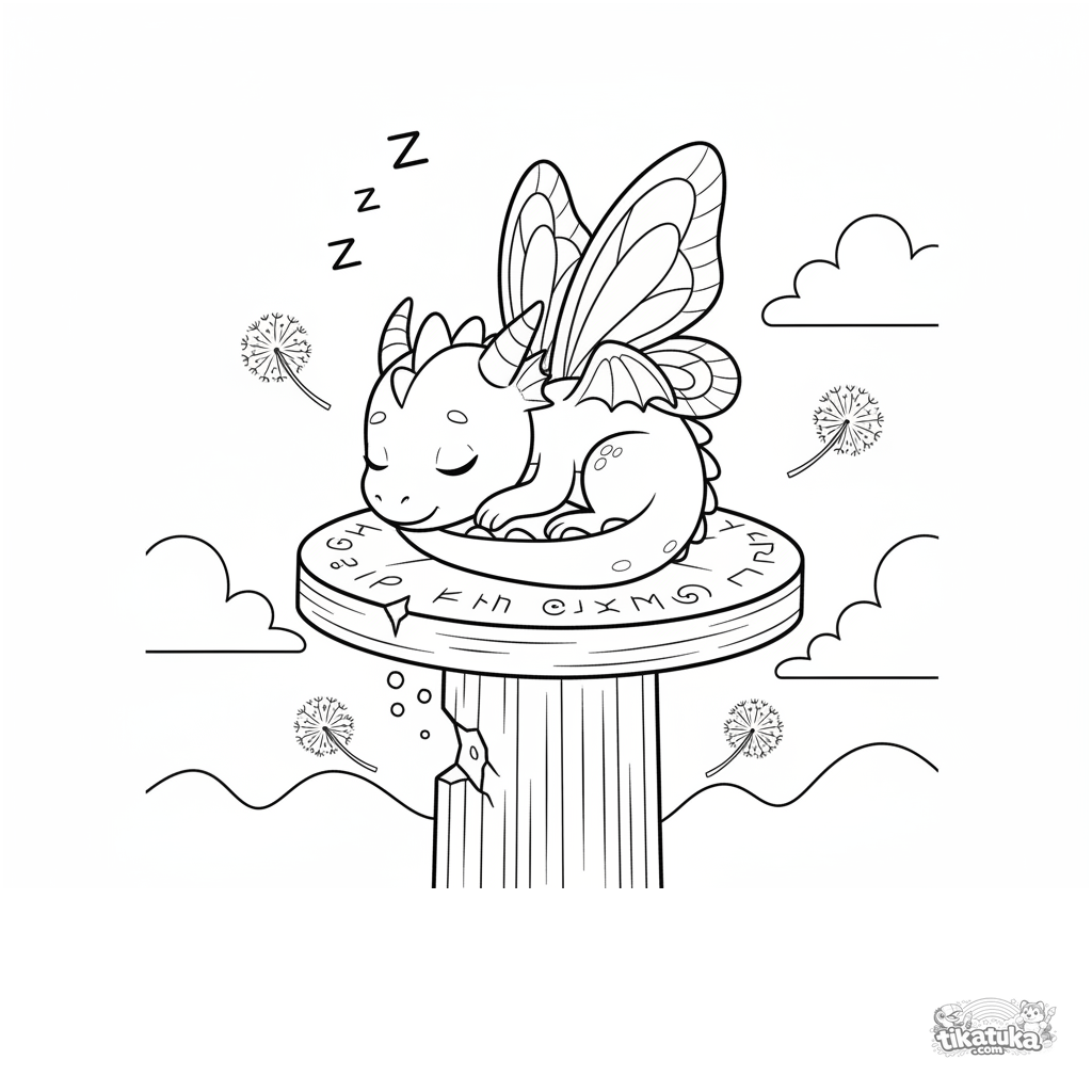 Ausmalbild für Kinder 4-6: Ein winziger Pixie-Drache schläft fest auf einem runden Runenstein. Weiche, fließende Linien, friedliche Stimmung, klare Formen.