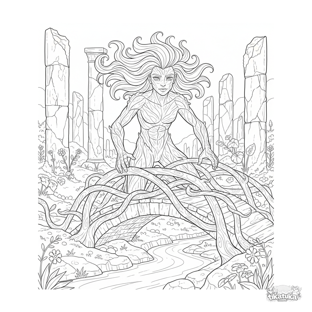 Ausmalbild eines Pflanzen-Superhelden, der eine Rankenbrücke in alten Waldruinen wachsen lässt. Für Kinder von 10-12 Jahren.