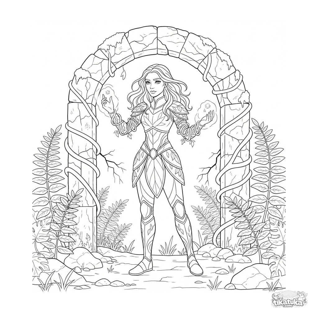 Ausmalbild für ältere Kinder 10-12: Ein pflanzenbetriebener Superheld benutzt leuchtende Ranken, um einen Steinbogen in überwucherten Waldruinen zu reparieren.