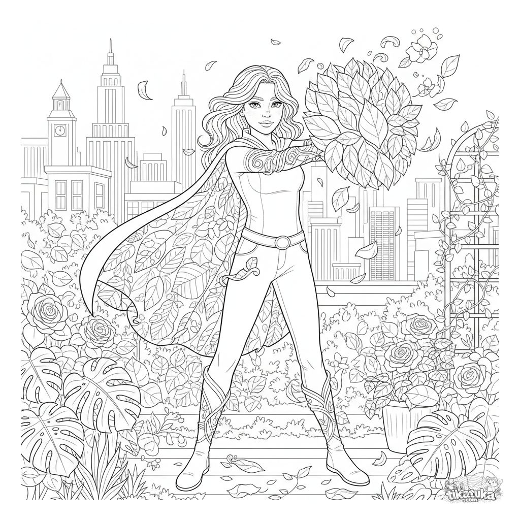 Ausmalbild für ältere Kinder 10-12: Ein pflanzenbetriebener Superheld erschafft ein blättriges Schild in einem Dachgarten über der Stadt.