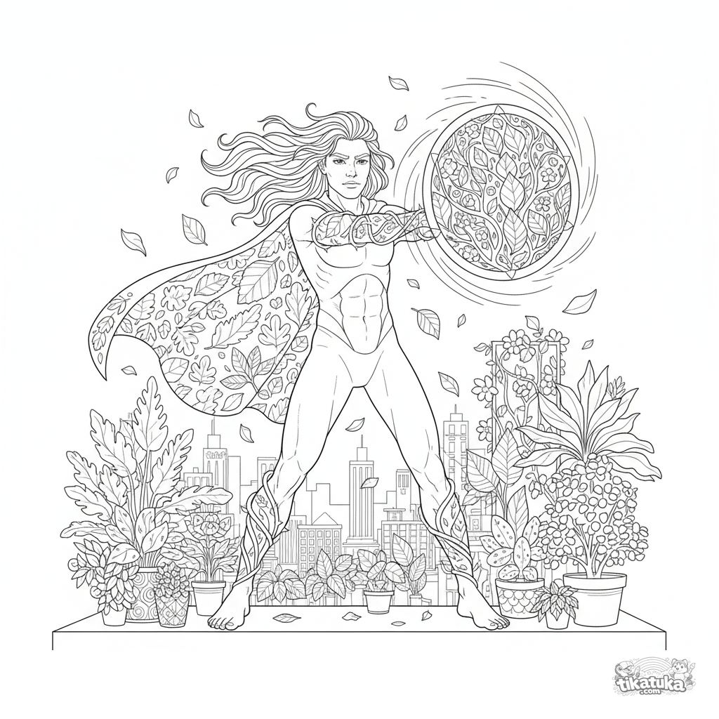 Ausmalbild für 10-12 Jahre: Ein Superheld mit Pflanzenkräften erschafft einen Blattschild auf einem städtischen Dachgarten. Detaillierte Szene mit Architektur.