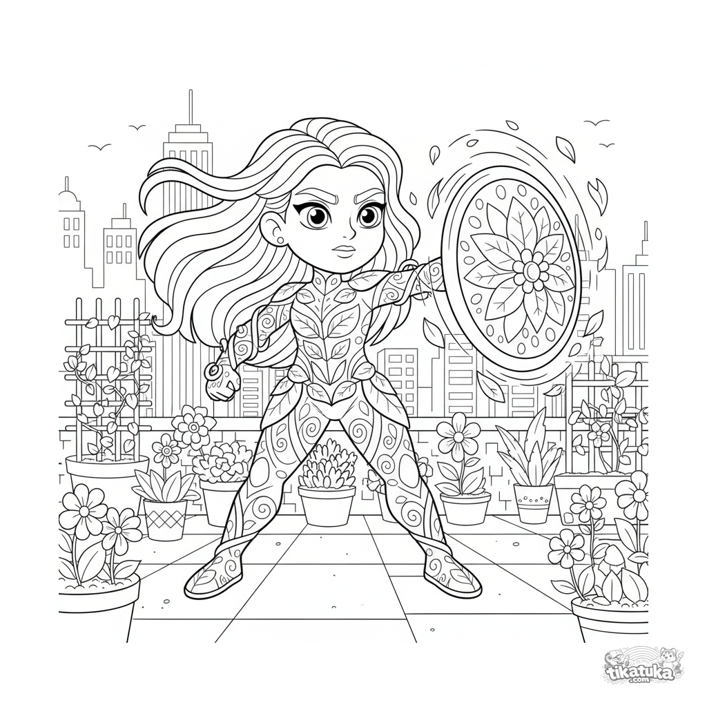 Ausmalbild für ältere Kinder 10-12: Ein pflanzenbetriebener Superheld erschafft ein Schild aus Blättern auf einem Dachgarten, entschlossener Gesichtsausdruck.