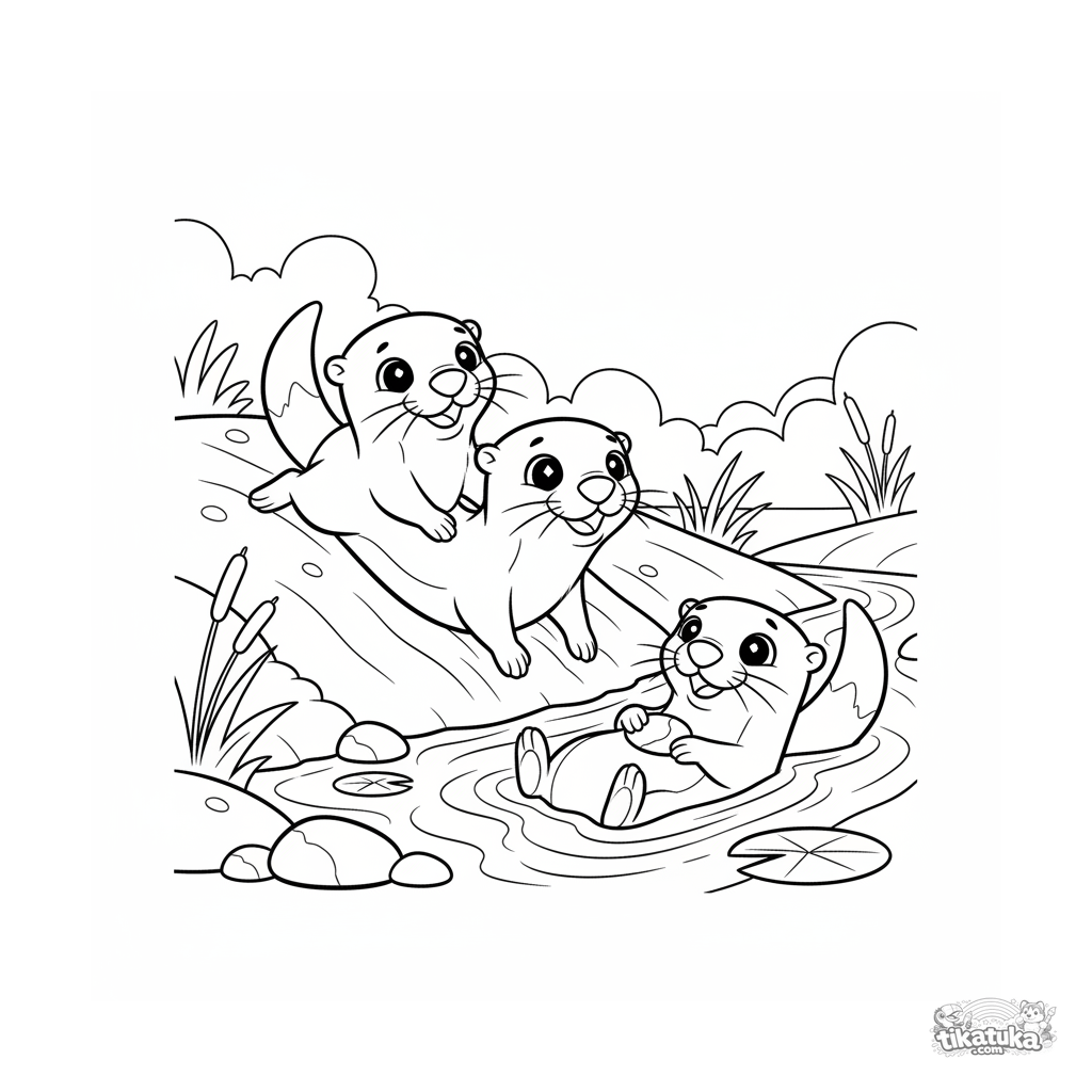 Ausmalbild für Kinder 7-9: Eine verspielte Otterfamilie rutscht ein schlammiges Ufer hinunter in einen klaren Bach. Eine dynamische und lustige Szene.