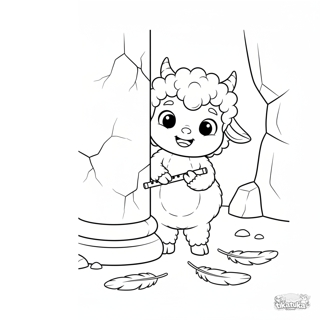 Ausmalbild für Kinder 4-6: ein verspieltes Satyr-Kind versteckt sich hinter einer Säule in Medusas Höhle. Niedliche, klare Szene.