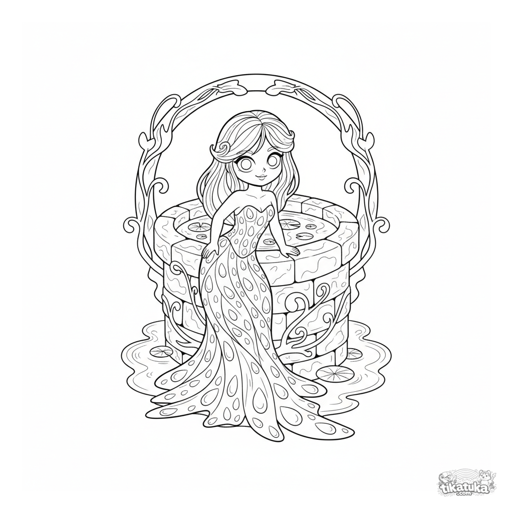 Ausmalbild für Kinder 7-9: Ein verspielter Wassergeist lugt aus dem Brunnen des lebendigen Wassers. Szene im Art-Nouveau-lite-Stil mit fließenden Linien.