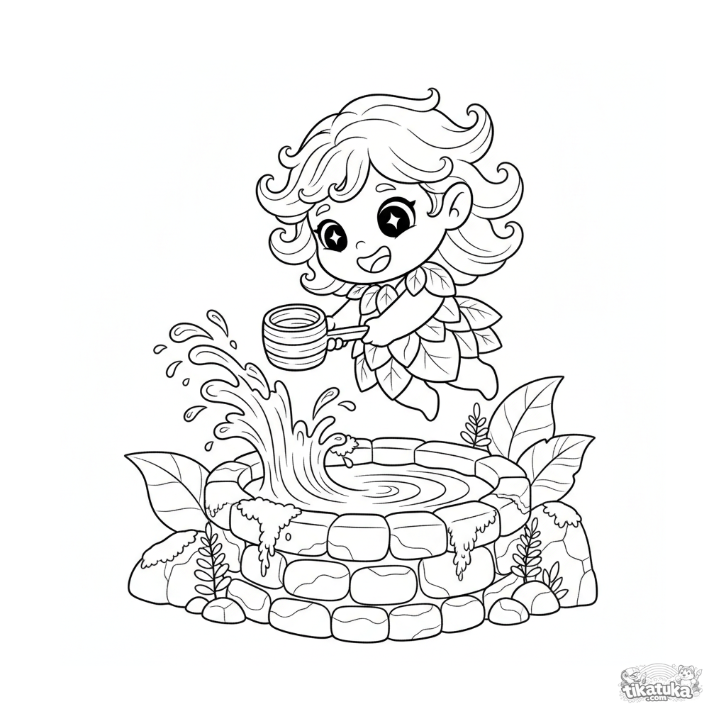 Ausmalbild für Kinder 4-6: Ein fröhlicher Wassergeist spielt mit Wasser am magischen Brunnen. Einfache Szene mit fliegenden Tropfen und Moos auf Steinen.