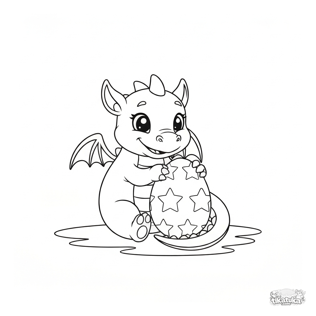 Kinder Ausmalbild: Ein runder, freundlicher Babydrache bewacht ein großes, sternförmiges Ei. Einfache und niedliche Märchenszene.