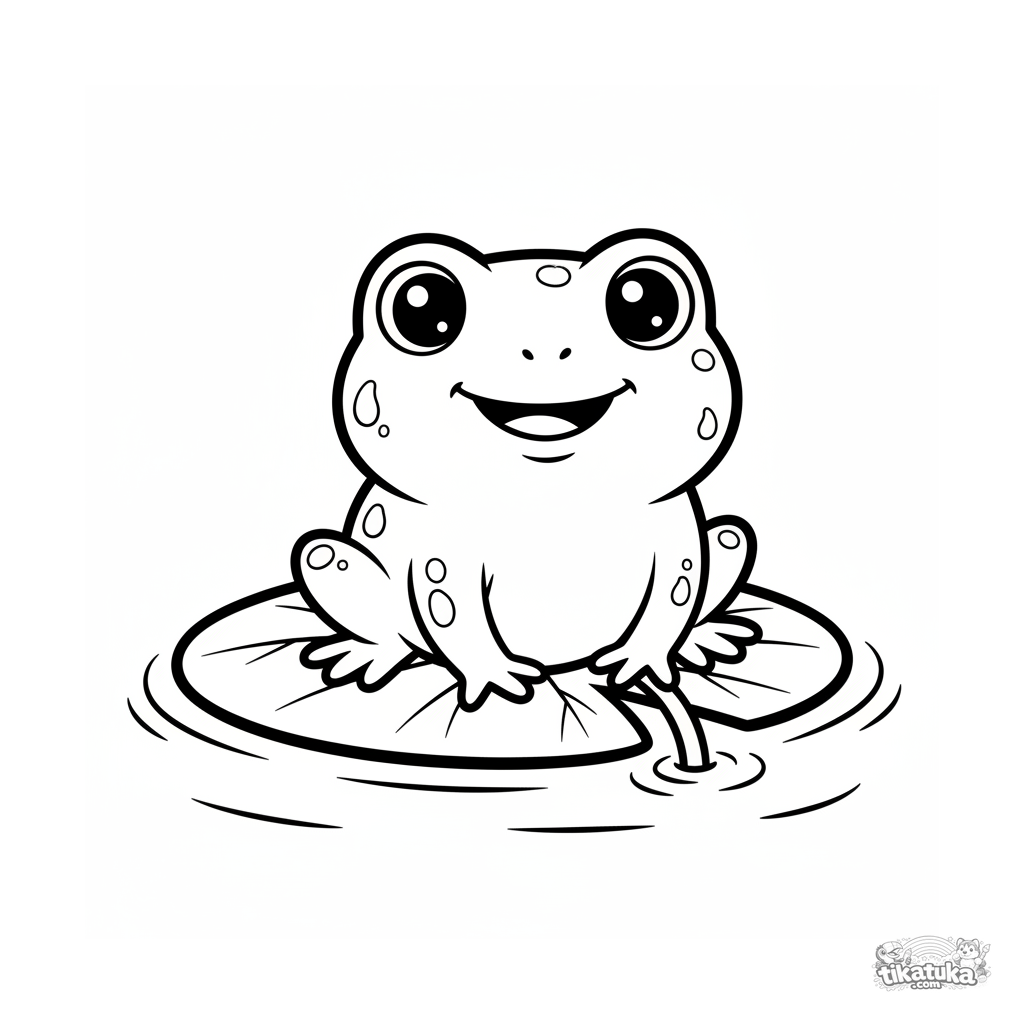 Einfaches Ausmalbild für Kleinkinder 2-3: Ein pummeliger, fröhlicher Frosch sitzt auf einem Seerosenblatt am Bach. Große einfache Formen, sehr breite Ränder.