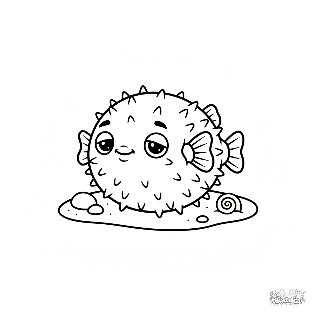 Einfaches Ausmalbild für Kleinkinder 2-3 Jahre: ein runder Kugelfisch ruht auf warmem Sand in der Sonne. Große, einfache Formen perfekt für erste Buntstifte.