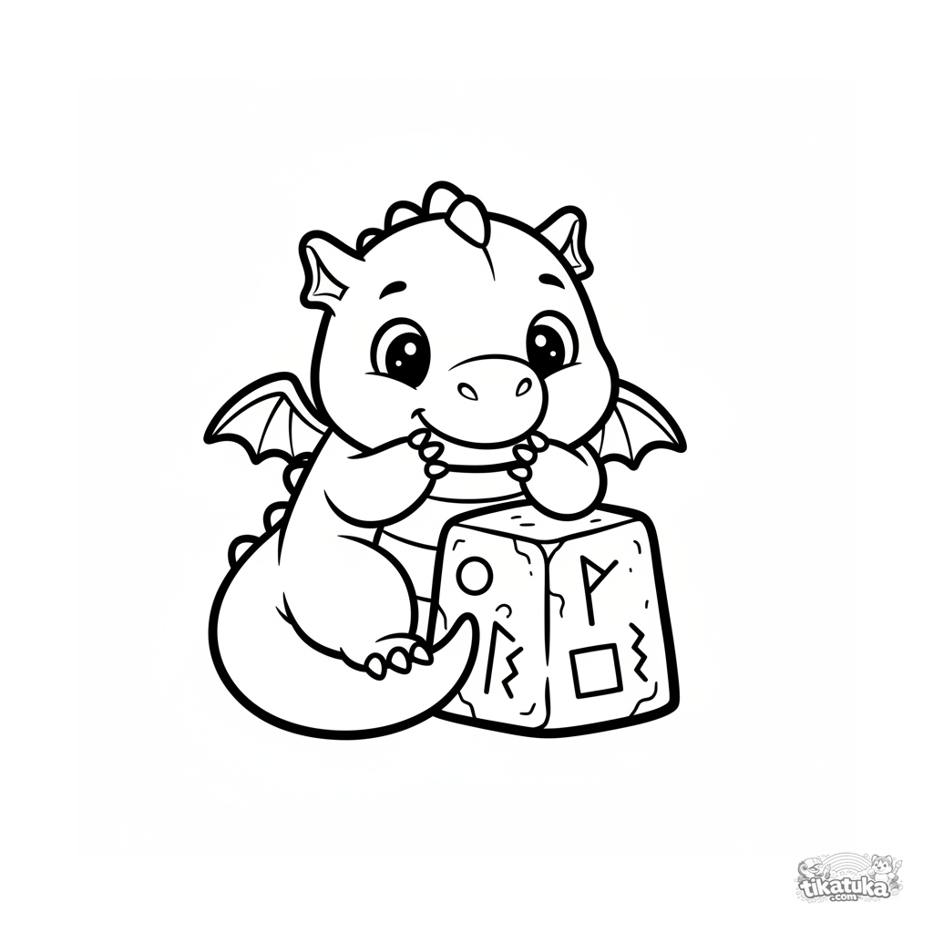 Einfaches Ausmalbild für Kleinkinder 2-3: Ein Plüsch-Baby-Drache spielt Verstecken hinter einem Runenstein. Riesige klare Formen, sehr wenige Details, dicke Umrisse.