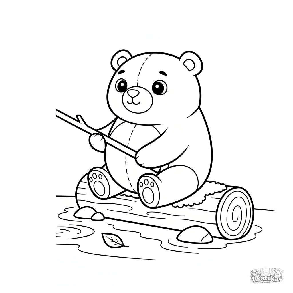 Einfaches Ausmalbild für Kleinkinder 2-3: Ein Plüschbär sitzt auf einem Baumstamm am Bach und versucht, mit einem Stock zu angeln.