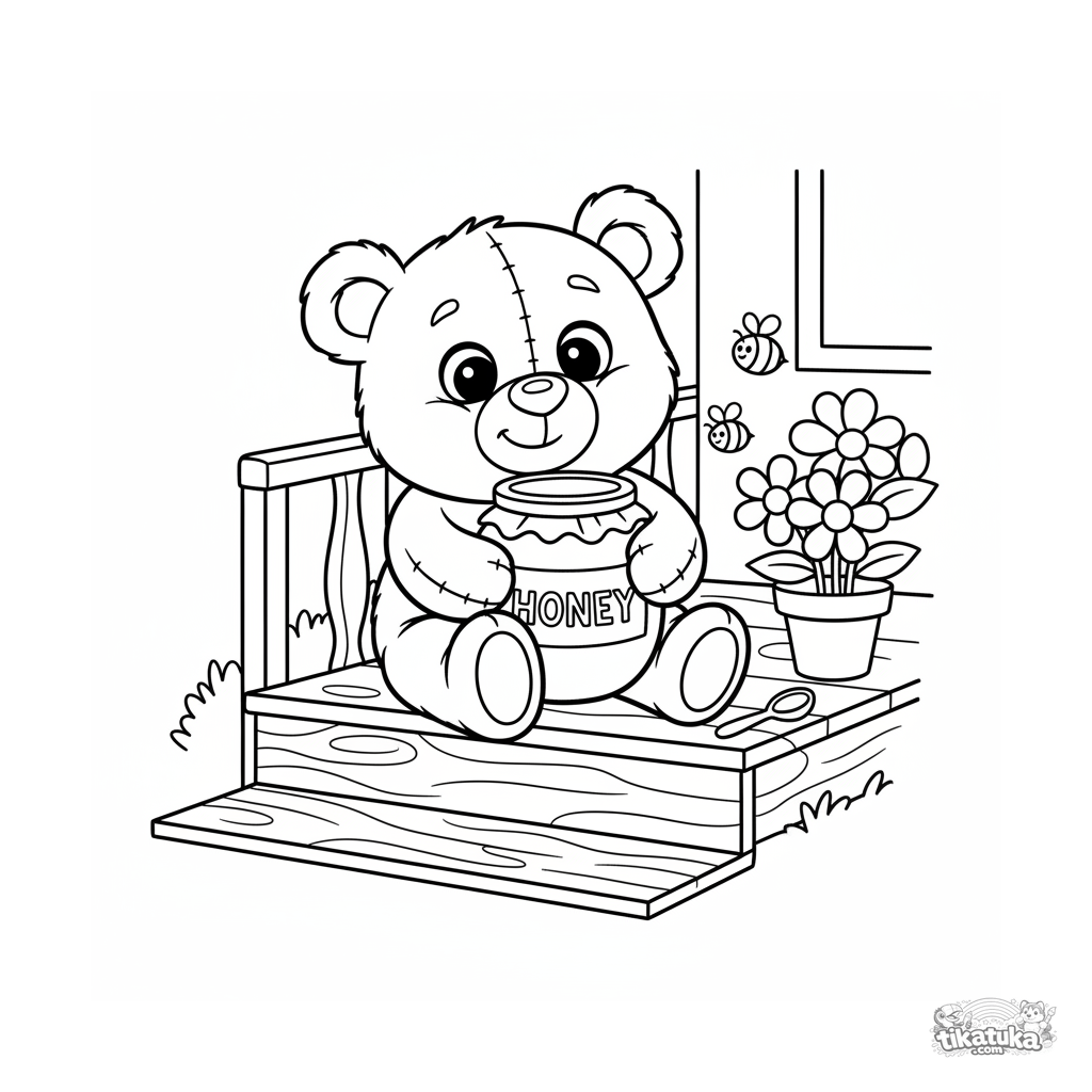 Einfaches Ausmalbild für Kleinkinder 2-3: Ein großer Plüschteddy sitzt auf einer Verandastufe mit einem Honigglas. Große Formen, wenig Details.