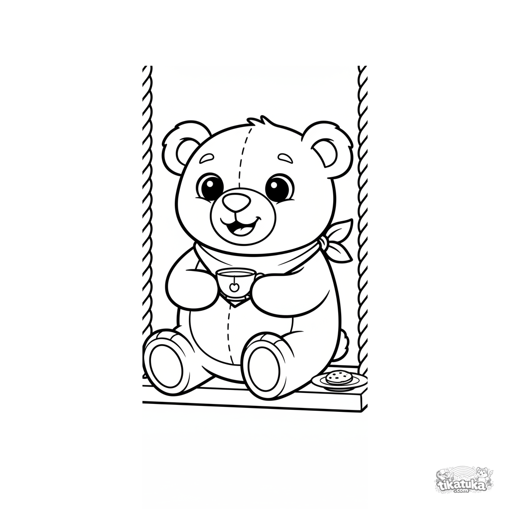 Kleinkind Ausmalbild 2-3 Jahre: ein großer Plüschbär sitzt auf einer Schaukel auf der Veranda und hält eine Teetasse. Einfache, große Formen.
