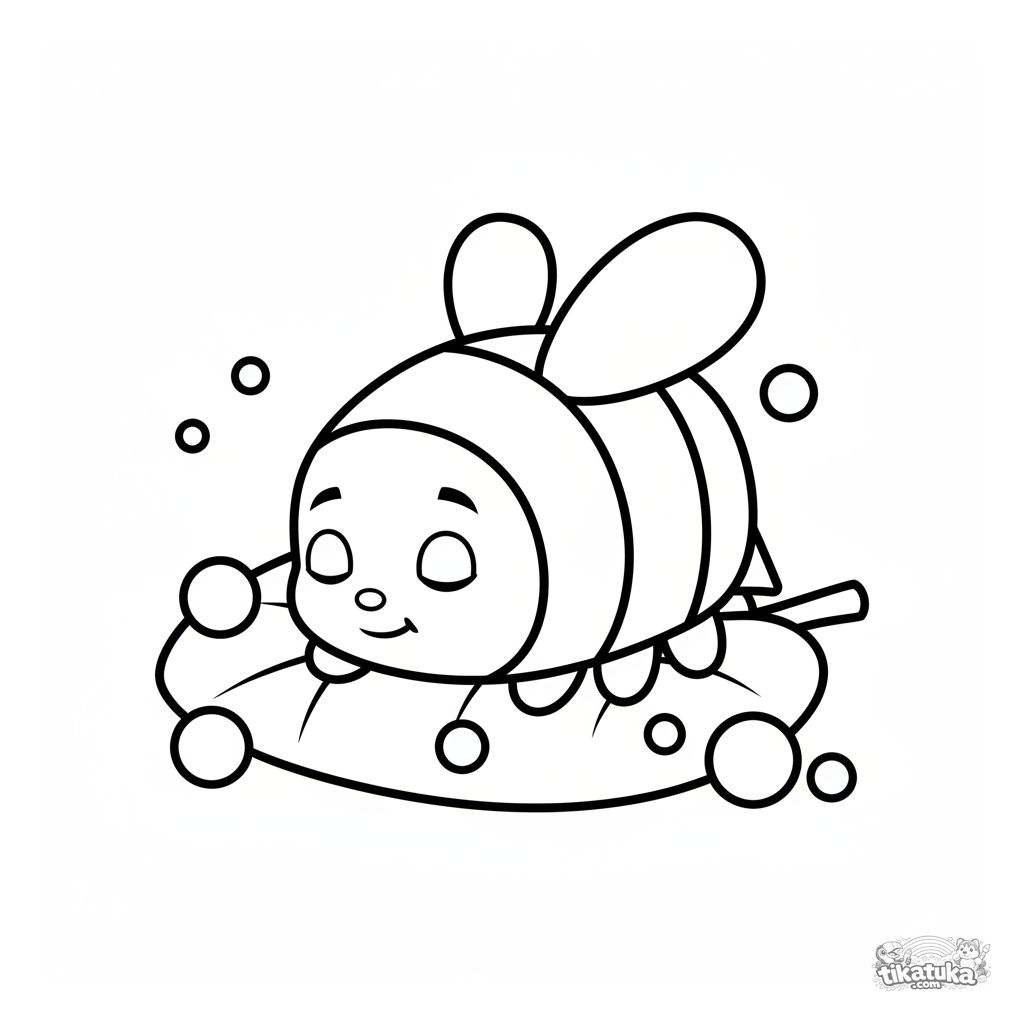 Einfaches Ausmalbild für Kleinkinder 2-3: Eine Plüschhummel schläft auf einem großen Blatt mit Tautropfen. Große Formen, wenige Details.