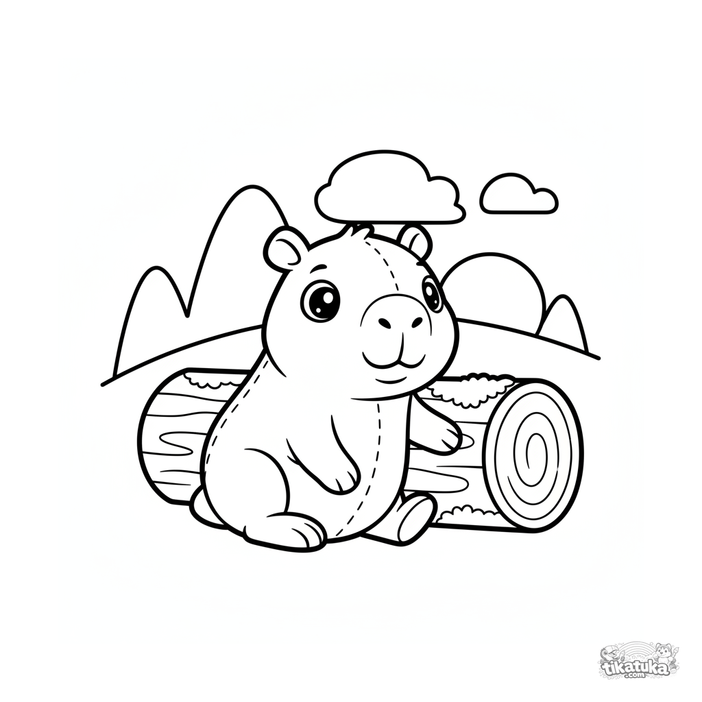 Einfaches Ausmalbild für Kleinkinder 2-3: Ein Plüsch-Capybara lehnt an einem Baumstamm und schaut in den Sonnenuntergang. Große Formen, wenige Details, perfekt für die Jüngsten.