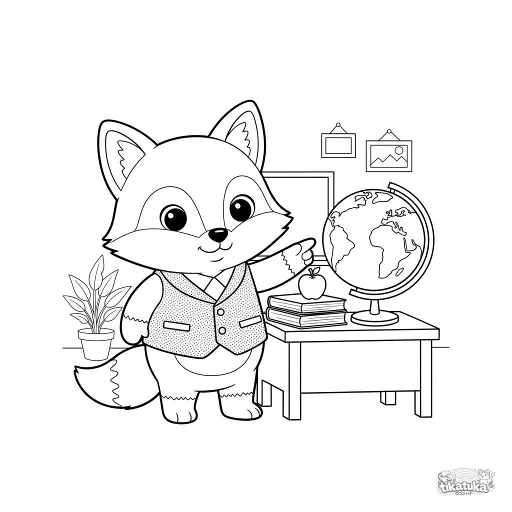 Ausmalbild für Kinder 4-6: Ein Fuchslehrer im Klassenzimmer mit Globus und Schulbüchern. Freundliche Szene zum Ausmalen.