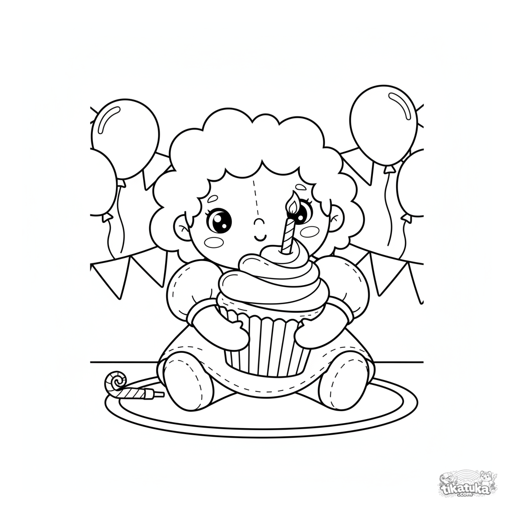 Sehr einfaches Ausmalbild für Kleinkinder 2-3: Ein Plüschmädchen umarmt einen Riesen-Cupcake. Große, geschlossene Formen.