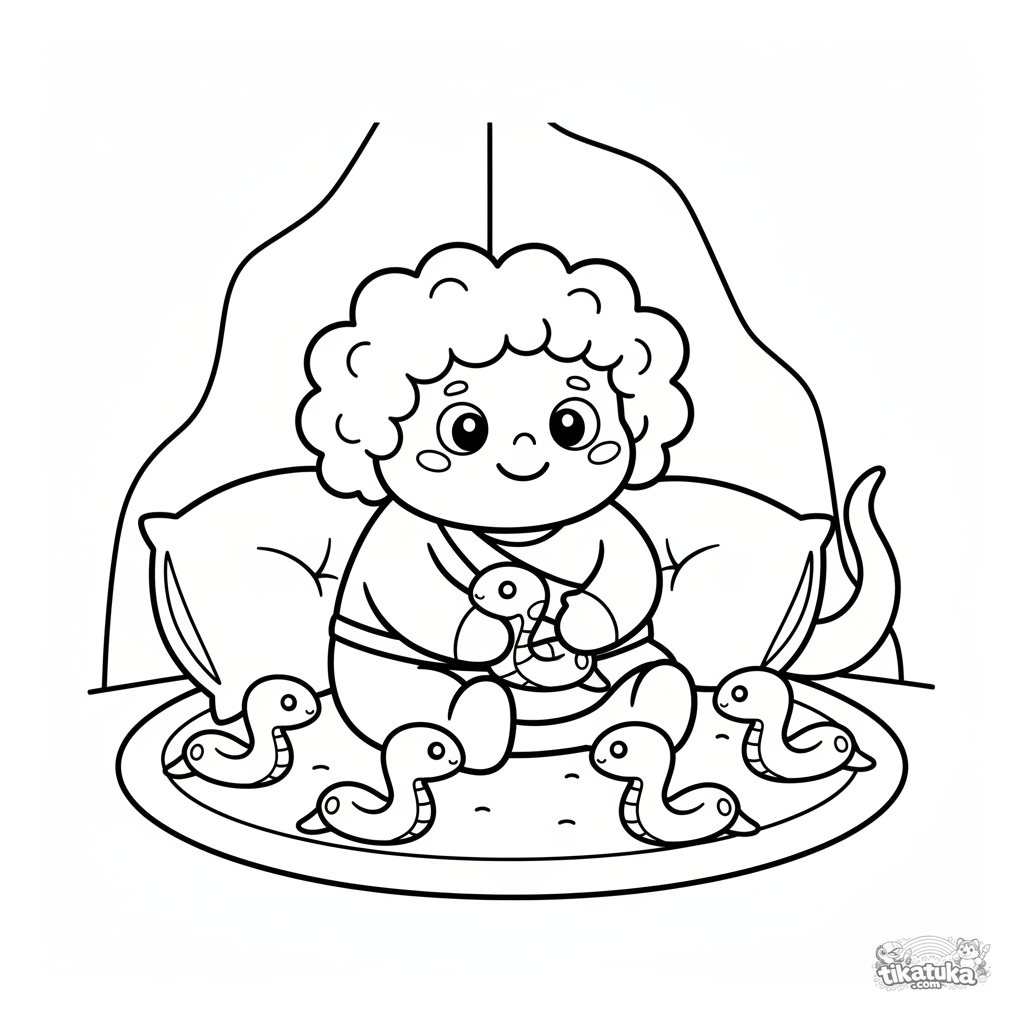 Niedliches Ausmalbild für Kleinkinder 2-3: Ein Hüter von Plüschschlangen in einer gemütlichen Ecke der Gorgonenhöhle.