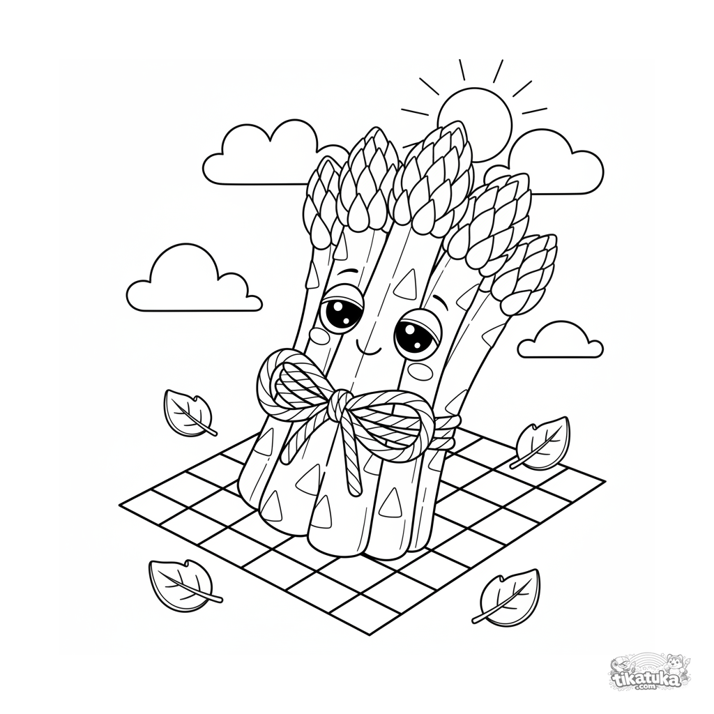Ein niedliches Plüsch-Spargelbündel schläft auf einer Picknickdecke. Ausmalbild für Kinder von 4-6 Jahren.